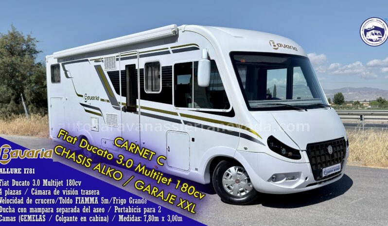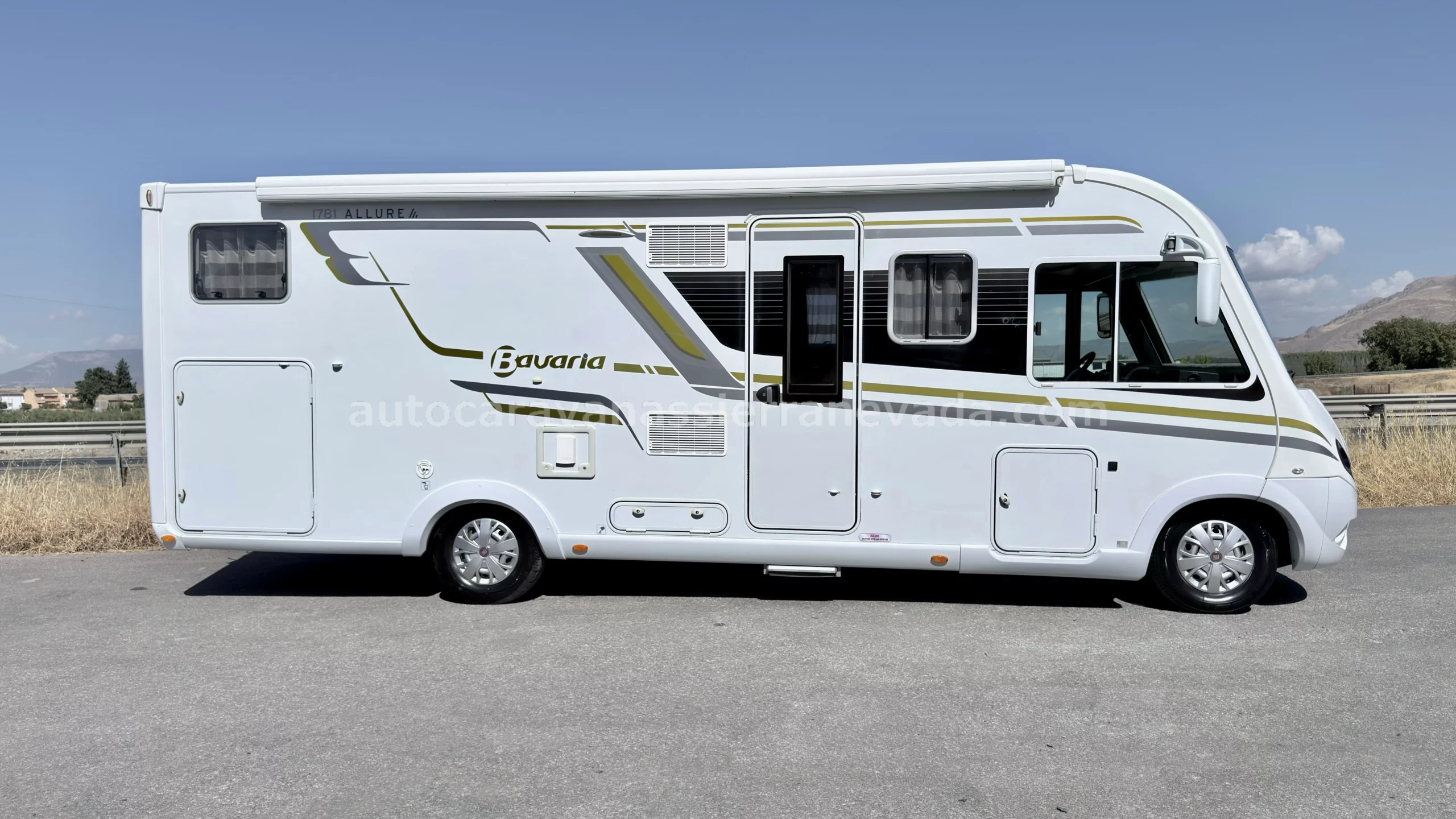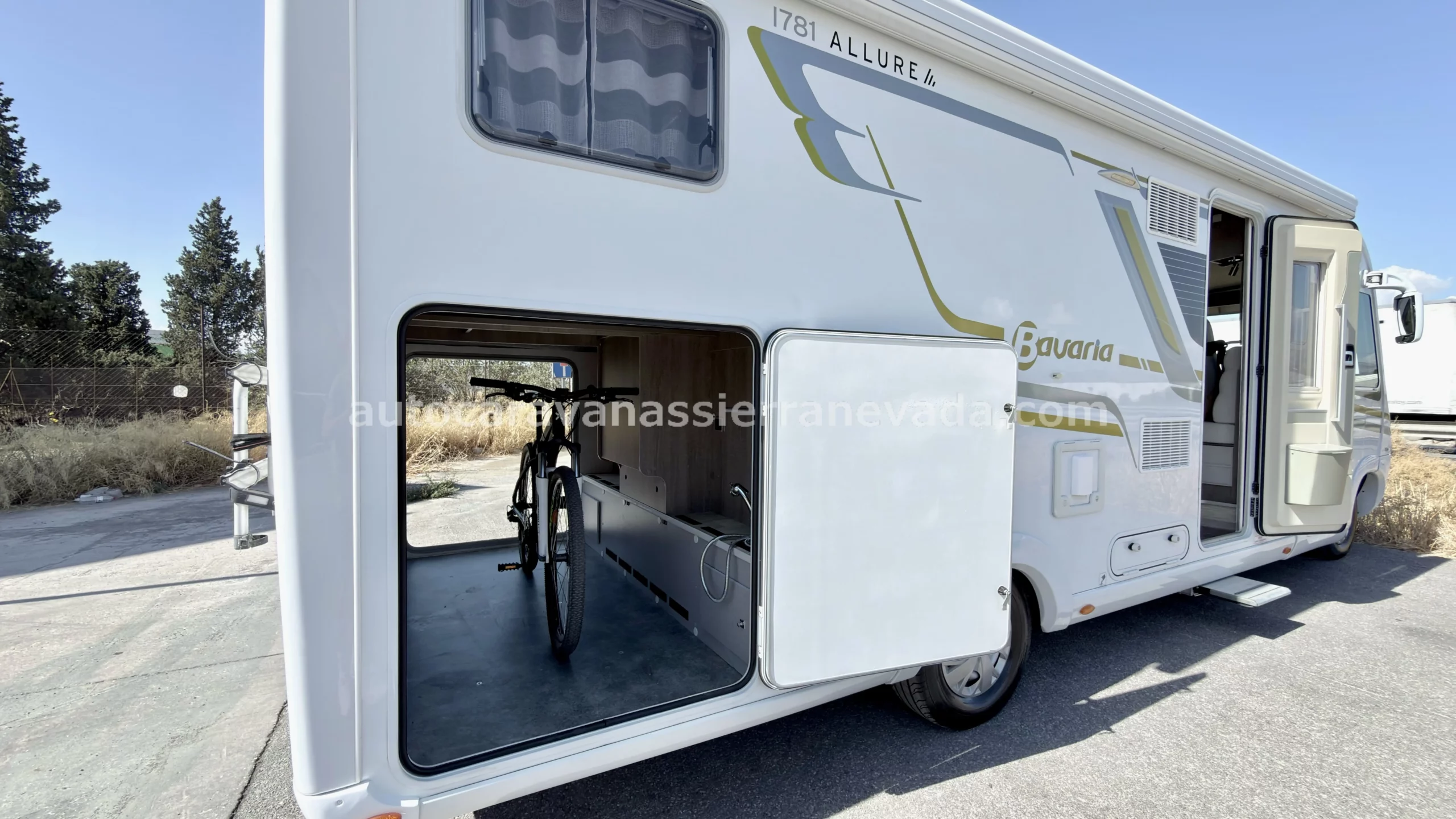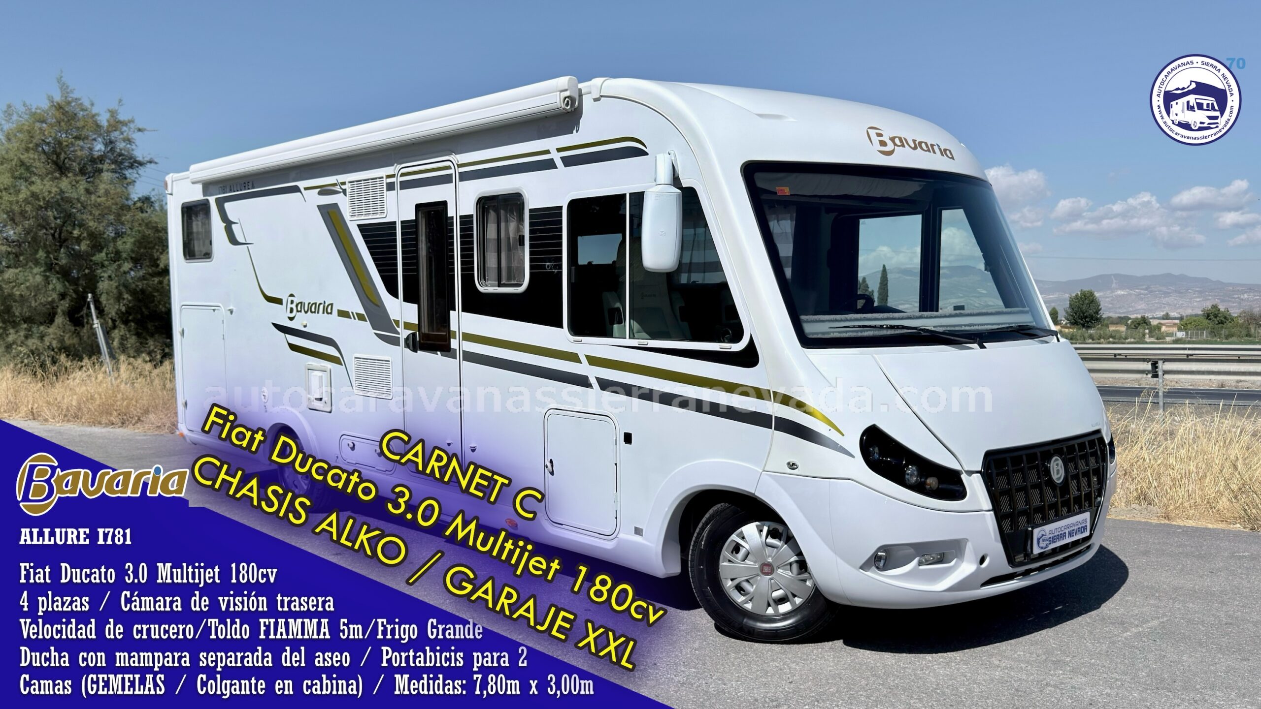 Autocaravana Integral de la marca, BAVARIA, modelo ALLURE I781. Esta marca está situada en el mercado entre una de las mejores de Europa. Tiene una línea muy actual, ambiente acogedor, con unos acabados y muebles de alta calidad. Año 2016 y con 82.000km y toda su documentación que los certifican, muy cuidad, procedente de particular. Motor Fiat Ducato 3.0 MultiJet 180cv y 6velocidades, muy duro,potente, de fácil mantenimiento y con CADENA DE DISTRIBUCIÓN. Chasis ALKO y Suspensión con barras de torsión (mucho mejor que la suspensión de ballestas) y con gran espacio de almacenamiento en el doble suelo .La calefacción y el agua caliente funcionan mediante  caldera ALDE, insonora y de radiadores como en casa, para calentar el habitáculo mucho más rápido. Con 4   plazas homologadas para viajar y dormir, gracias a su Cama colgante doble sobre cabina y Gemelas en la parte trasera, convertible en una sola cama central gigante para dormir incluso 3 personas. Dispone de un maletero con doble portón muy espaciosa, sus medidas son: (2,25m x 1,40m x 1,20m), donde podrá llevar moto y bicicletas. Esta increíble autocaravana mide: (7,80m x 3,00m) perfecta para hacer largos viajes o vivir en ella. ESTE VEHÍCULO SE CONDUCE CON EL CARNET C.  M.M.A 4.500kg teniendo una gran cualidad que es la gran capacidad de carga.