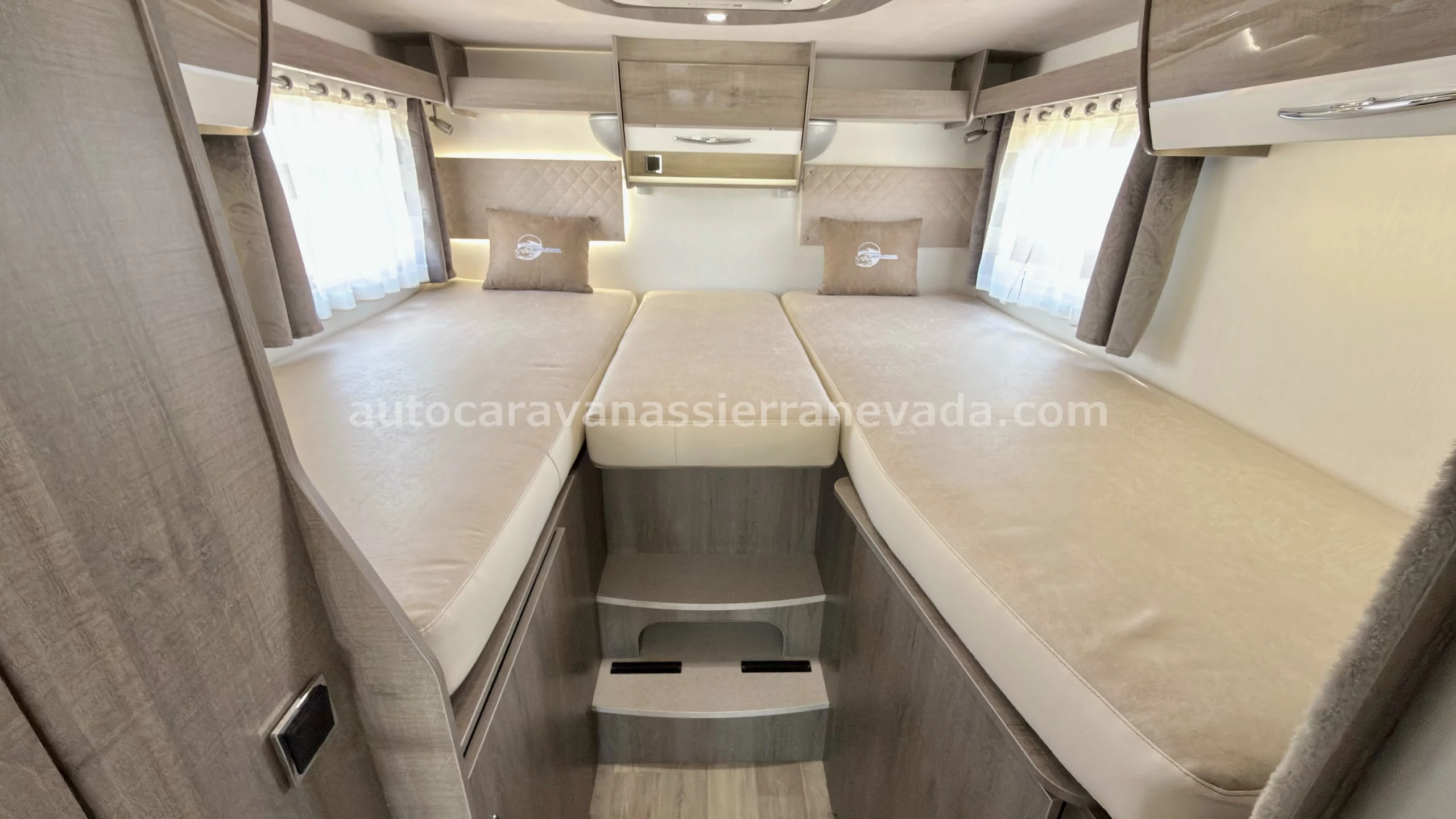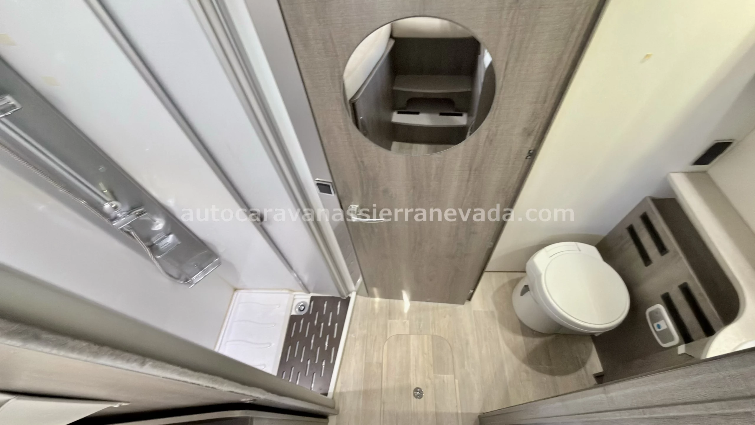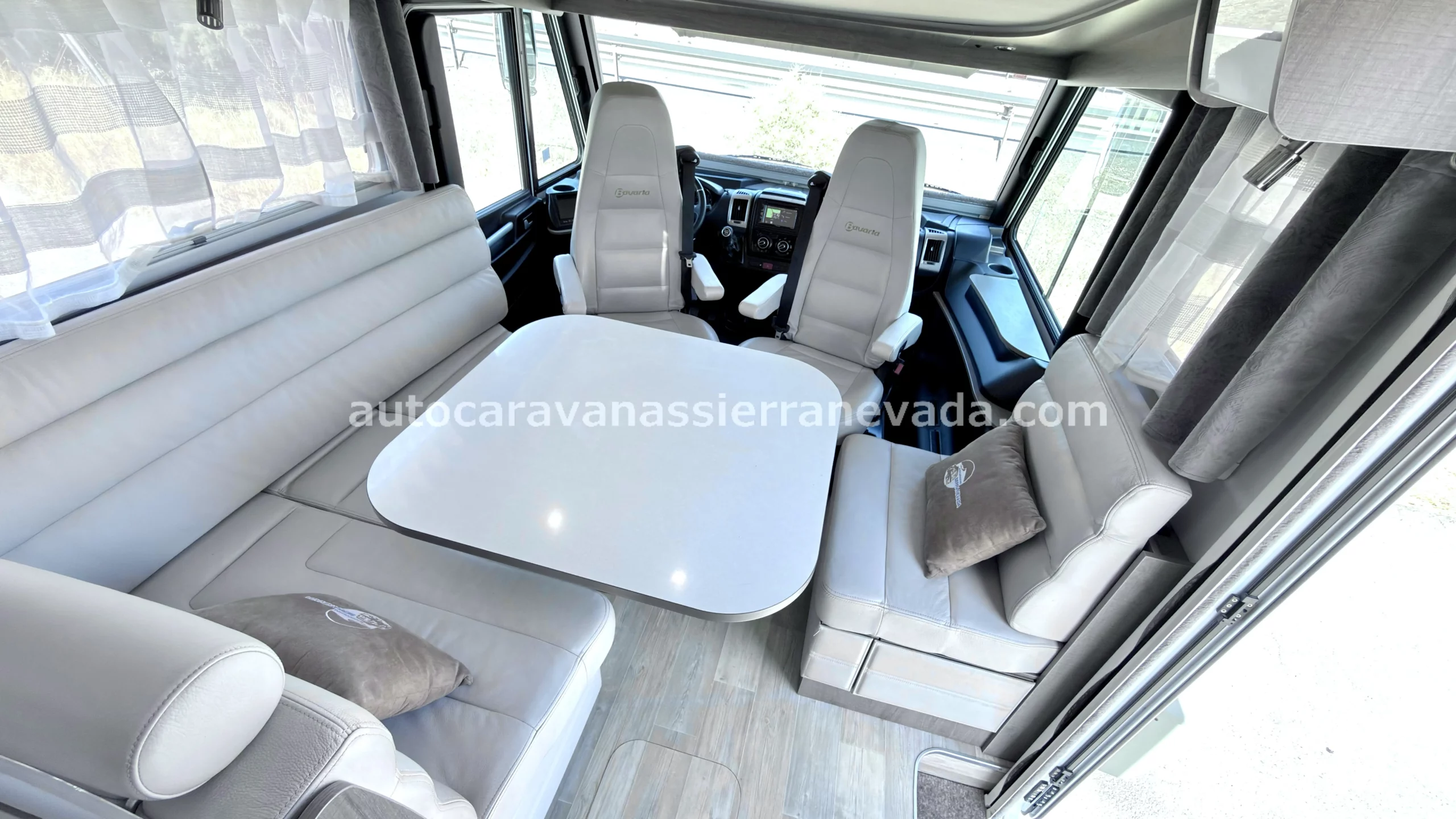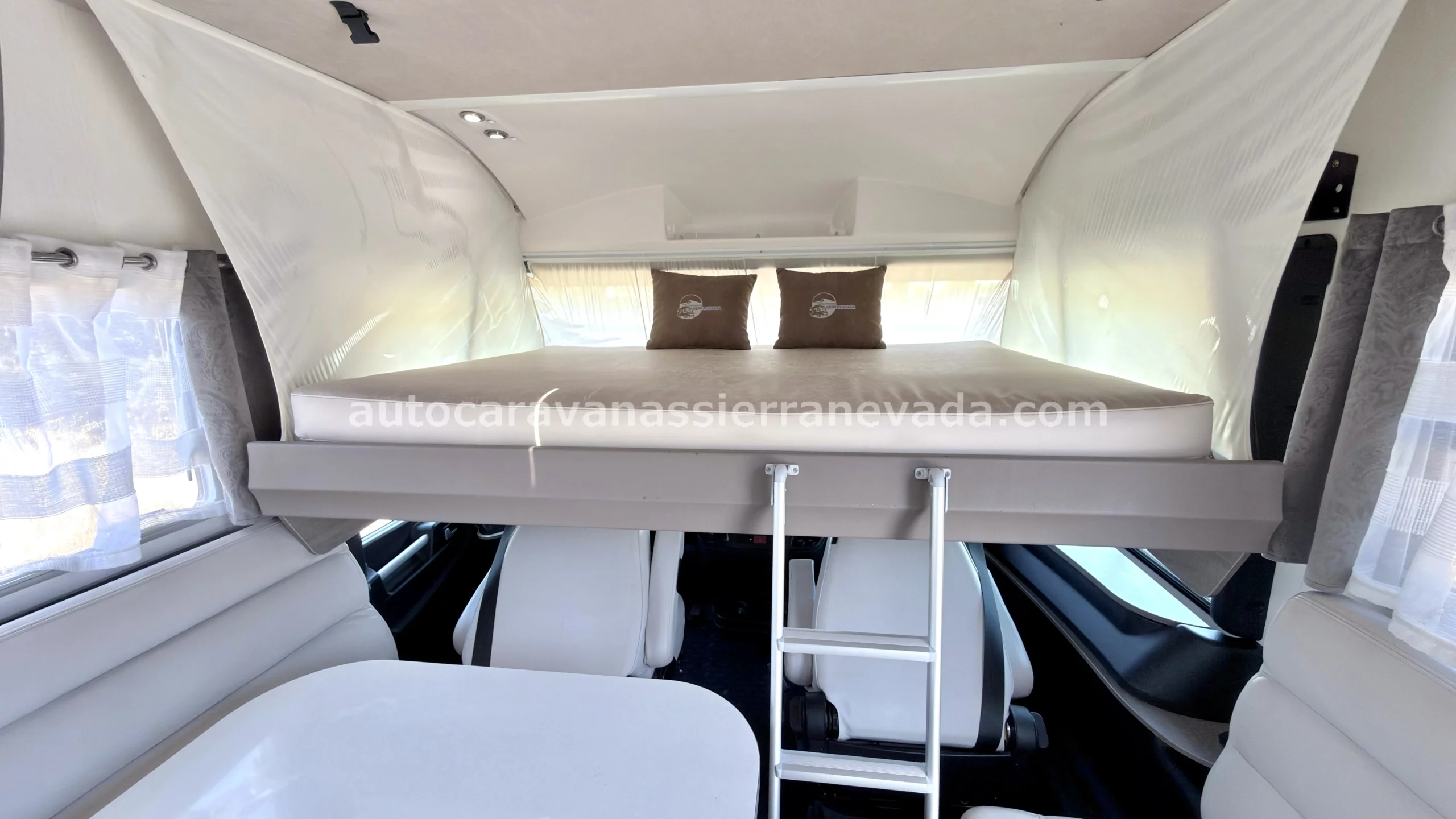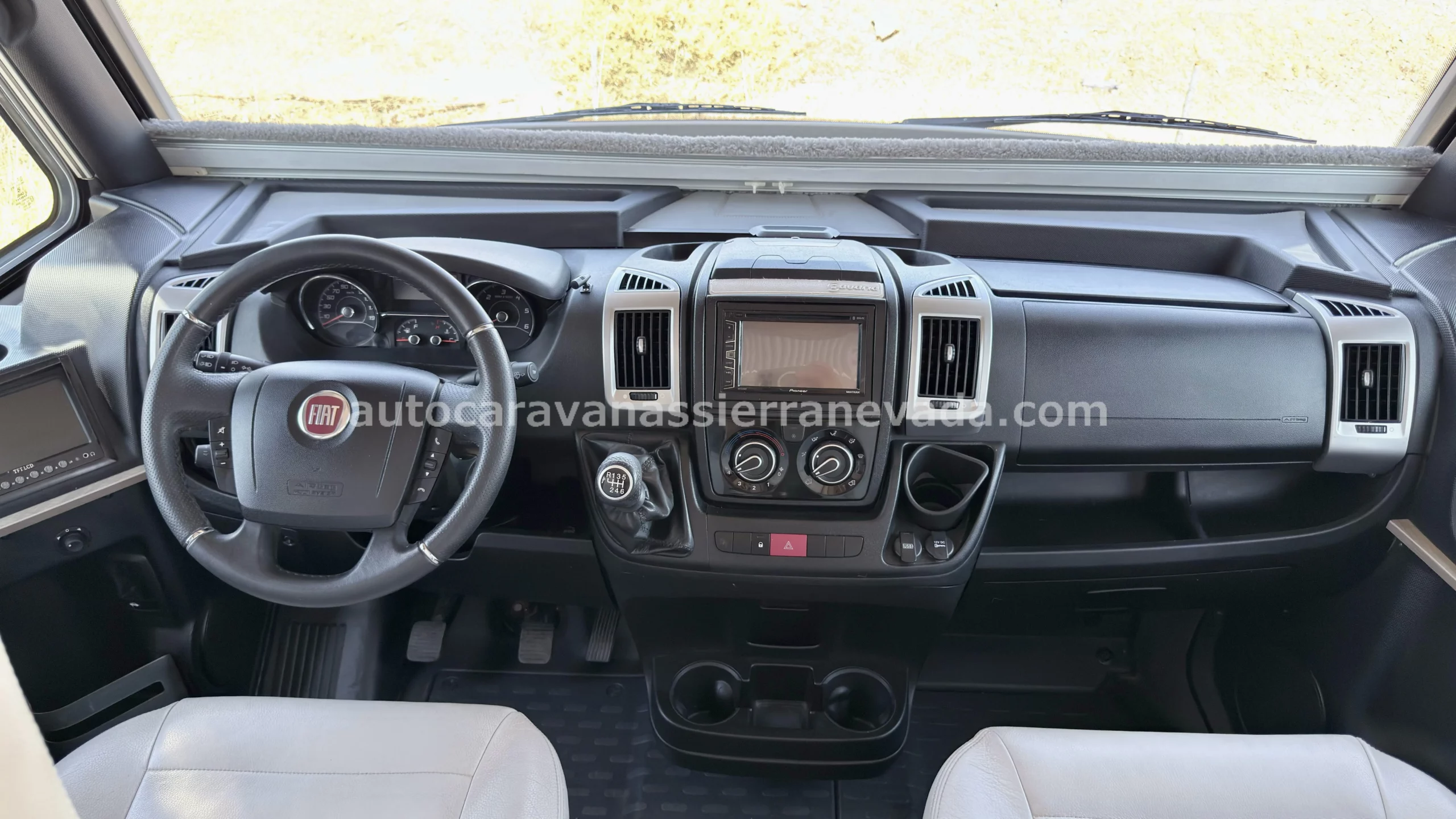 Aire acondicionado (de motor) AirBag (conductor y copiloto)Velocidad de Crucero Cierre centralizado. Espejos eléctricos(no se mueve a los lados) Elevalunas eléctricos (sólo conductor) Radio (2DIN -CD-USB-BT-Navegador). Cámara de visión trasera. Asientos giratorios. Oscurecedores REMIS en cabina completa. Mosquiteras en ventanas, claraboyas y puerta principal. Claraboyas transparentes y Claraboya xxl en salón. Frigo DOMETIC (220v, Gas, 12v, Auto) 160L capacidad Extractor de humos. Ducha con mampara separada de aseo. WC con SOG. Batería de 95ah. 2 Placa solar de 100w. Calefacción ALDE. Tv 12v. (TDT-HDMI-USB-DVD) Escalón eléctrico de aluminio. Toldo FIAMMA F45 de 5m. Portabicis  para 2. Ducha exterior. Maleteros laterales con acceso al doble suelo. Grandes huecos de almacenaje bajo camas gemelas. Neumaticos reforzados marca MICHELIN especial camper
