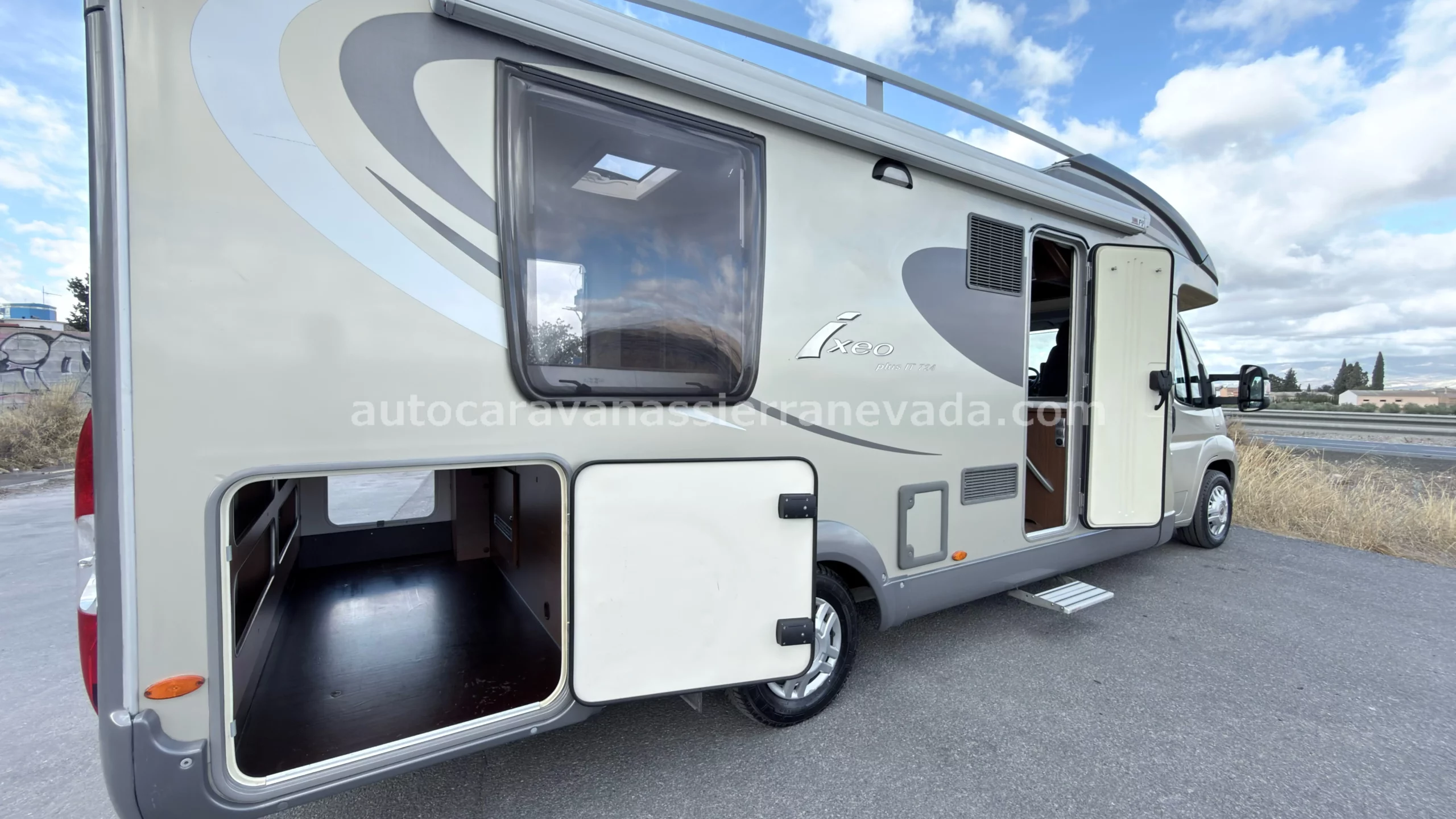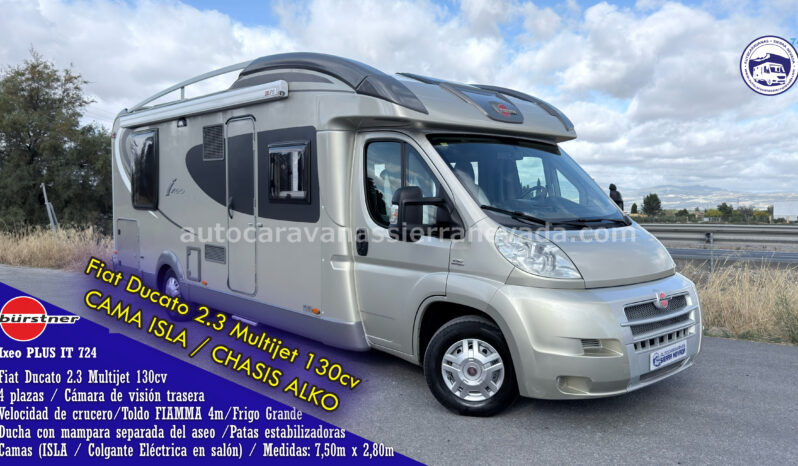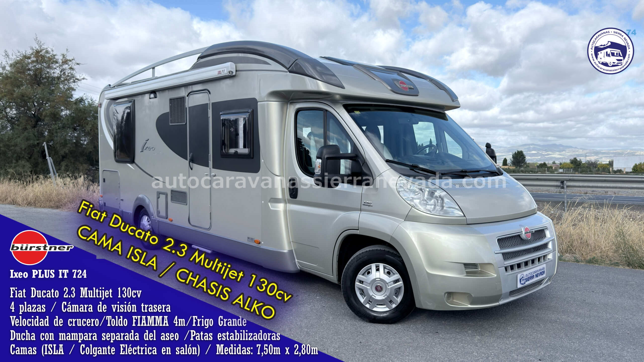 Autocaravana perfilada de la prestigiosa y mejor marca del mercado BURSTNER modelo Ixeo PLUS IT 724. Esta marca aporta un diseño tanto interior como exterior muy actual, con terminaciones y acabados de la máxima calidad, en perfiladas. Chasis ALKO y Suspensión con barras de torsión (mucho mejor que la suspensión de ballestas). Con 105.000km, del año 2010 y con motor Fiat Ducato 2.3 MultiJet 130cv, muy potente y con mucha fuerza. Dispone de una claraboya XXL en la cabina muy amplia, por donde le entrara mucha claridad y dándole una sensación de amplitud y mucha ventilación. Con 4 plazas para viajar y dormir, Cama Colgante eléctrica en salón para dos personas y Cama Isla con grandes huecos de almacenaje, uno de los modelo más selecto, ideal para parejas, la facilidad y comodidad a la hora de hacerla y levantarse de ella, hace que sea el modelo de cama más demandado por nuestros clientes. Dispone de un gran garaje con doble prton, muy espacioso con unas medidas: (2,15m x 0,95m x 0,85m). Cuenta con una distribución muy amplia, moderna y espaciosa gracias a sus medidas:(7,50m x 2,80m) ideal para vivir en ella y hacer grandes viajes. Se conduce con carnet B, el normal.