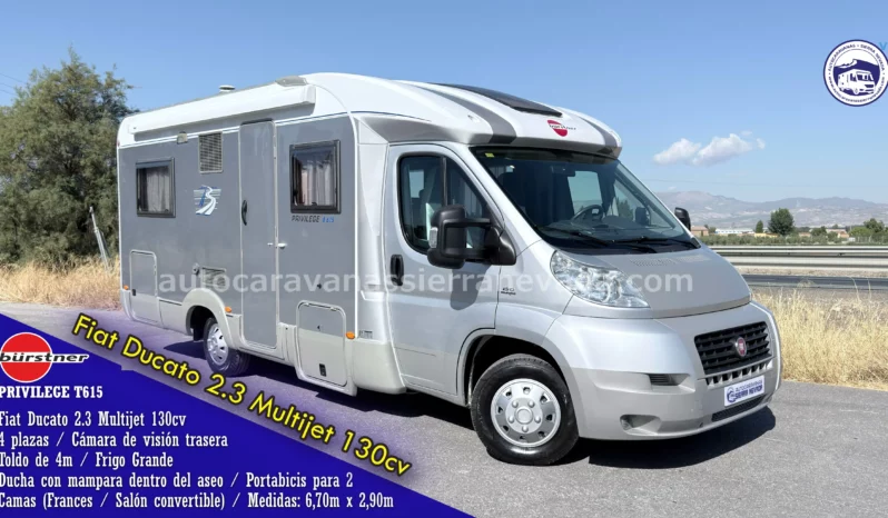 Autocaravana perfilada BÜRSTNER, modelo PRIVILEGE T615. Una de las marcas más valoradas del mercado. Con un Motor es el Fiat Ducato 2.3 MultiJet 130cv, muy duro y de fácil mantenimiento. Dispone de una claraboya panorámica en cabina muy amplia y una claraboya XXL en cocina por donde le entra mucha claridad dándole una sensación de amplitud y mucha ventilación Del año 2007 y con 104.000km. Homologada en documentación para viajar 4 plazas. Dispone de dos camas dobles, Francesa en la parte trasera con acceso al garaje y salón convertible muy sencillo de hacer. Un vehículo ideal para gente que quiere una autocaravana muy cómoda de llevar y entrar en aparcamientos reducidos, se conduce igual que un turismo, con unas medidas: (6,70m x 2,90m). Tiene un buen maletero lateral al que puedes acceder desde el exterior o levantando la cama francesa: (2,10m x 0,85m x 1,20m).