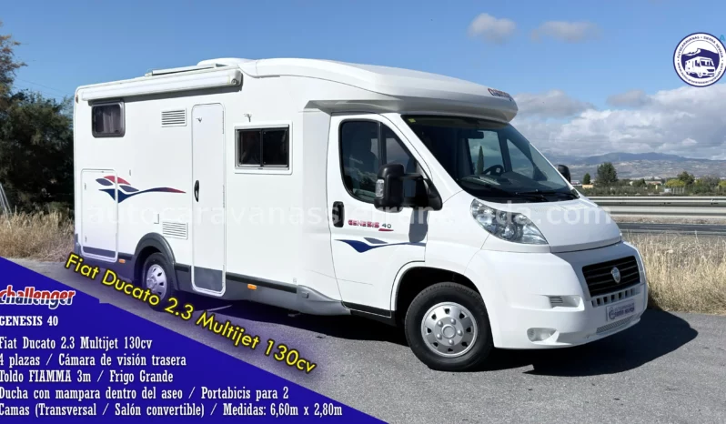 Autocaravana Perfilada CHALLENGER, modelo GENESIS 40. Una de las marcas más valoradas del mercado con grandes acabados de calidad y durabilidad. Muy cuidada. Con Motor Fiat Ducato 2.3 MultiJet 130cv y 6 velocidades, muy duro, potente y de fácil mantenimiento. Del año 2007 con 95.000km. Dispone de 4 plazashomologadas en documentación para viajar y dormir. Sus camas: Transversal en la parte trasera y Salón Convertible. Ideal para gente que quiere una autocaravana muy cómoda de llevar y entrar en aparcamientos reducidos, se conduce igual que un turismo, Medidas: (6,60m x 2,80m). Consta de un climatizador a 12v.Dispone de un maletero XXL, sus medidas:(2,20m x 1,05m x 1,10m),