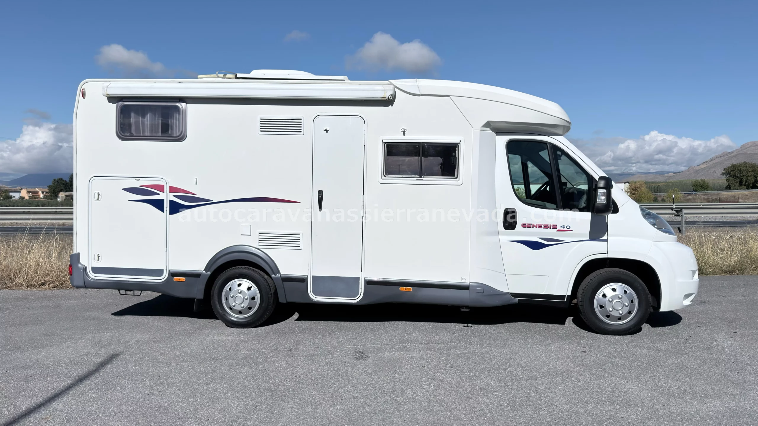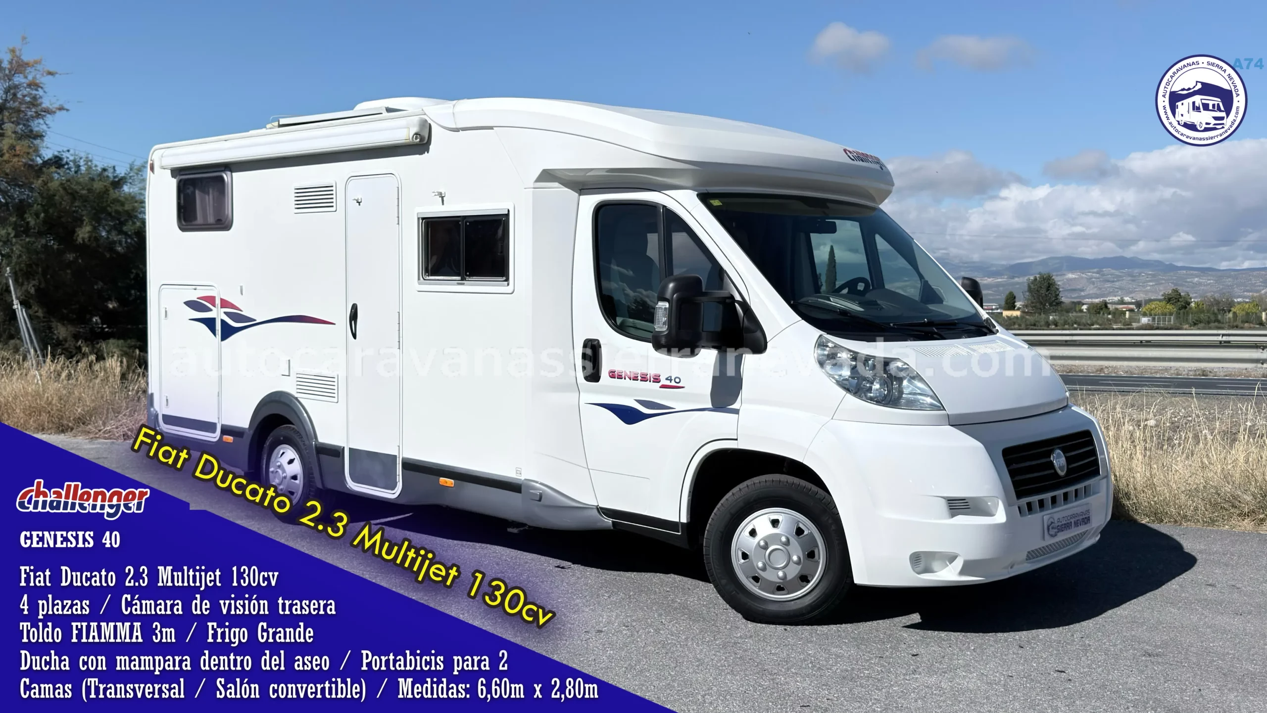 Autocaravana Perfilada CHALLENGER, modelo GENESIS 40. Una de las marcas más valoradas del mercado con grandes acabados de calidad y durabilidad. Muy cuidada. Con Motor Fiat Ducato 2.3 MultiJet 130cv y 6 velocidades, muy duro, potente y de fácil mantenimiento. Del año 2007 con 95.000km. Dispone de 4 plazashomologadas en documentación para viajar y dormir. Sus camas: Transversal en la parte trasera y Salón Convertible. Ideal para gente que quiere una autocaravana muy cómoda de llevar y entrar en aparcamientos reducidos, se conduce igual que un turismo, Medidas: (6,60m x 2,80m). Consta de un climatizador a 12v.Dispone de un maletero XXL, sus medidas:(2,20m x 1,05m x 1,10m),