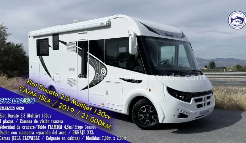 Autocaravana Integral CHAUSSON, modelo EXALTIS 6028.un modelo exclusivo, de muy alta gama y con unos materiales y acabados dignos de este modelo .Una de las marcas más valoradas del mercado. Con un motor Fiat Ducato 2.3 MultiJet 130cv / 6 Velocidades, muy potente, duro, robusto y de bajo consumo. Del año 2019 con tan solo 21.000km. Procedente de partícula, no proviene de alquiler, mucho mejor que comprarla nueva ya que el impuesto de matriculación (muy elevado) y el IVA está incluido en este precio. Muy cuidado, prácticamente un vehiculo de reestreno. Dispone de 4 plazas homologadas en documentación para viajar y dormir. Sus camas:Cama Isla elevable manual en la parte trasera. Uno de los modelo más selecto, ideal para parejas, la facilidad y comodidad a la hora de hacerla y levantarse de ella, hace que sea el modelo de cama más demandado por nuestros clientes y Colgante en cabina, ambas muy amplias. Con un Garaje doble portón XXL sus medidas son: (2,15 largo x 1,00 ancho x 1,20 alto) donde podrá llevar bicicletas o moto. Un vehículo muy bien distribuido y espacioso, perfecta para vivir en ella, con unas Medidas: (7,00m x 2,90m).