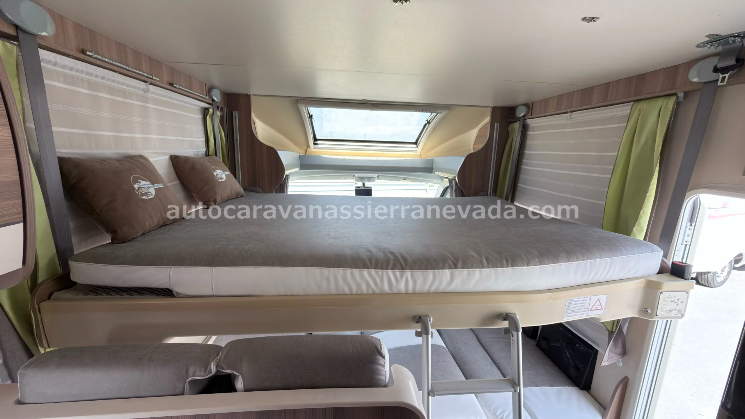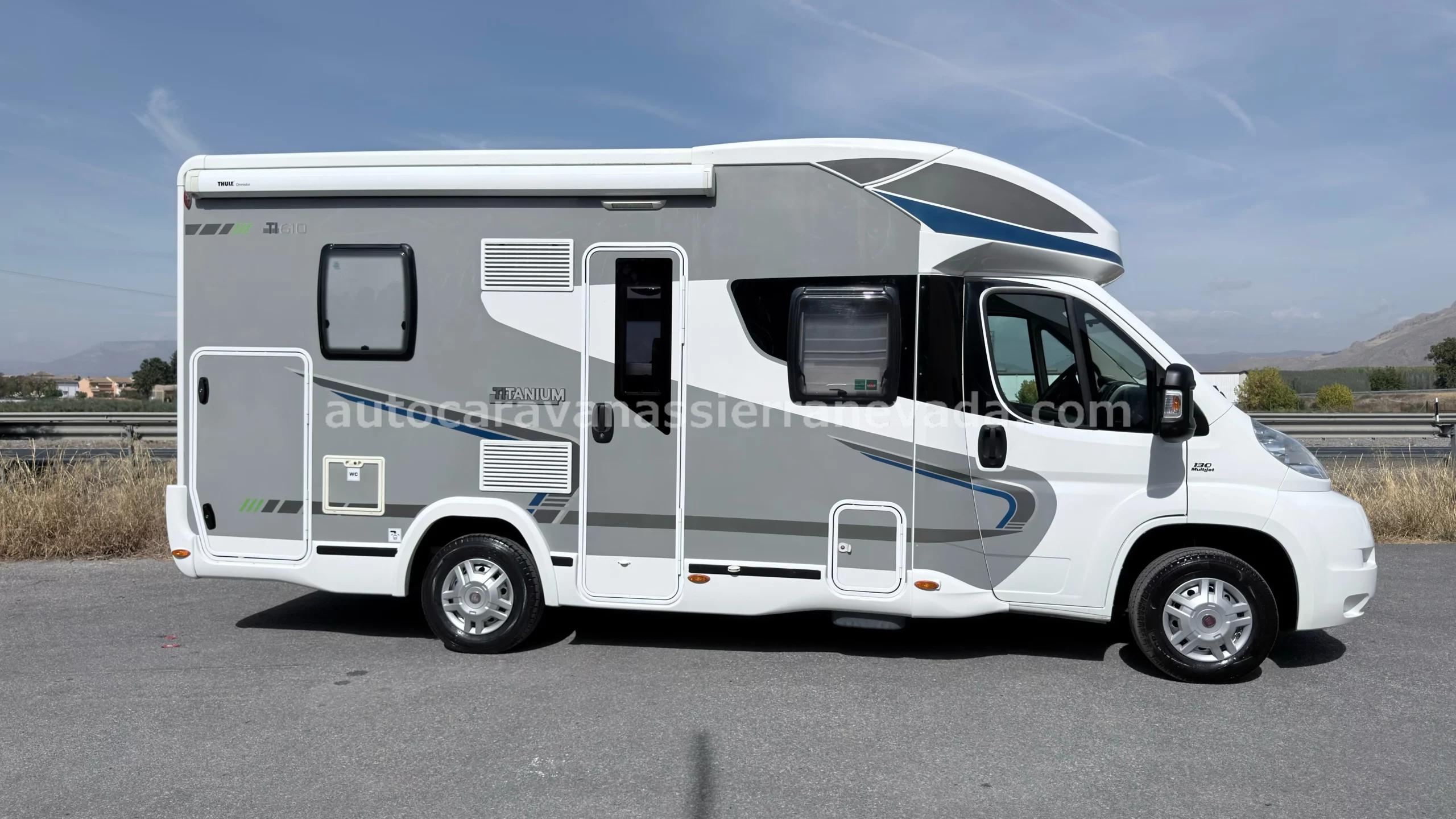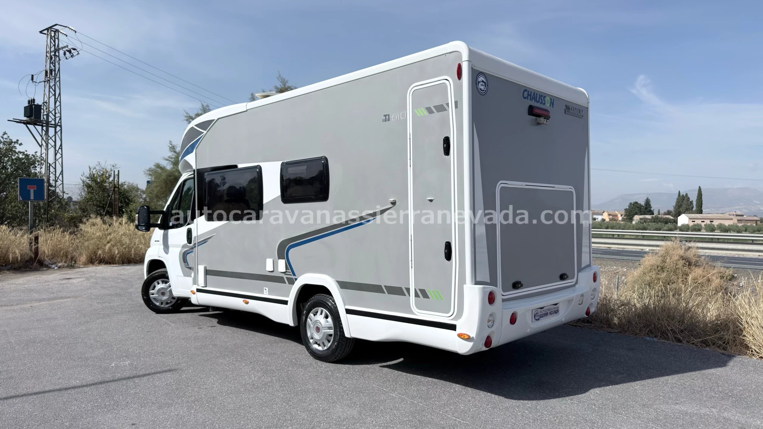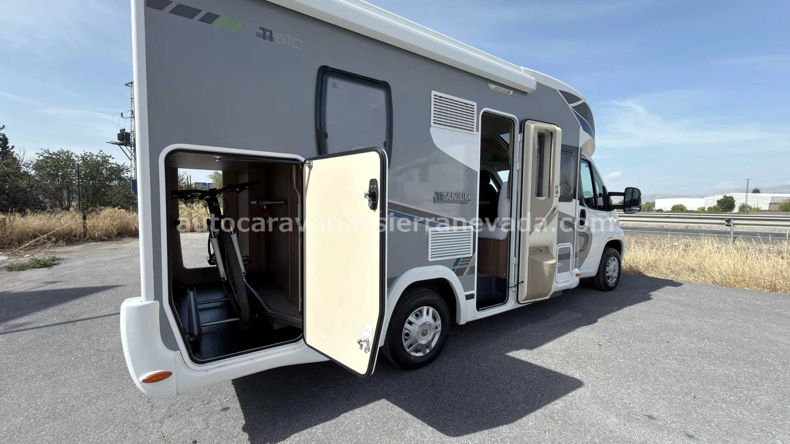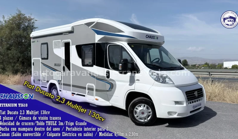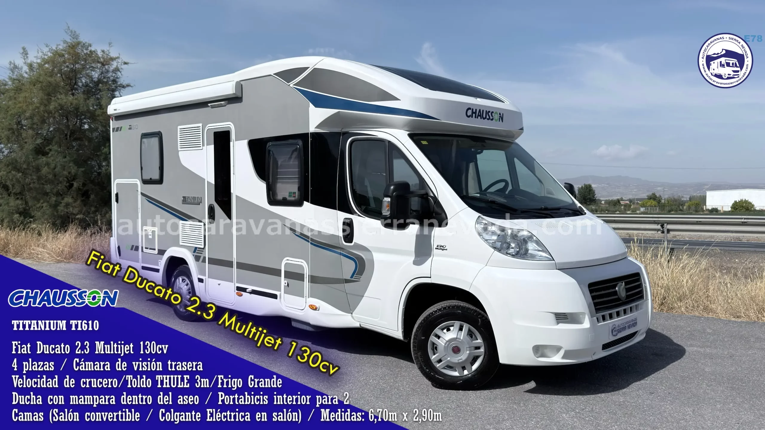 Autocaravana Perfilada de la marca Chausson, modelo TITANIUM TI610. Una de las marcas más valoradas por su dureza en su construcción, durabilidad, comodidad y seguridad. Con un diseño moderno y elegante. Dispone de una claraboya panorámica en cabina muy amplia, por donde le entra mucha claridad dándole una sensación de amplitud y mucha ventilación. Con un comedor FACE TO FACE espacioso y acogedor. Del año 2014 con tan solo 63.000km. Con motor, Fiat Ducato 2.3 Multijet 130cv y seis velocidades, muy duro, potente y de fácil mantenimiento. La autocaravana, al ser de tamaño reducido y ligera, mantiene muy bien una velocidad constante de 140km/h, incluso subiendo puertos de montaña a 100km/h sin cambiar de marcha y haciendo un bajo consumo gracias a su perfil aerodinámico. Consta de un boiler TRUMA para agua caliente + Calefacción de gasoil WEBASTO. Con 4 plazas homologadas en documentación para viajar y dormir gracias a sus siguientes camas: Colgante eléctrica en salón + Salón convertible muy amplia y cómoda de hacer gracias a su mesa eléctrica. Dispone de un garaje con doble portón de unas medidas: (2,20 largo x 0,70 ancho x 1,25 alto). Ideal para gente que quiere una autocaravana muy cómoda de llevar y entrar en aparcamientos reducidos, se conduce igual que un turismo, Medidas: (6,70m x 2,90m). Consta de un baño trasero muy amplio, con un grandísimo vestidor encima de la bodega que ocupa el ancho del vehículo.