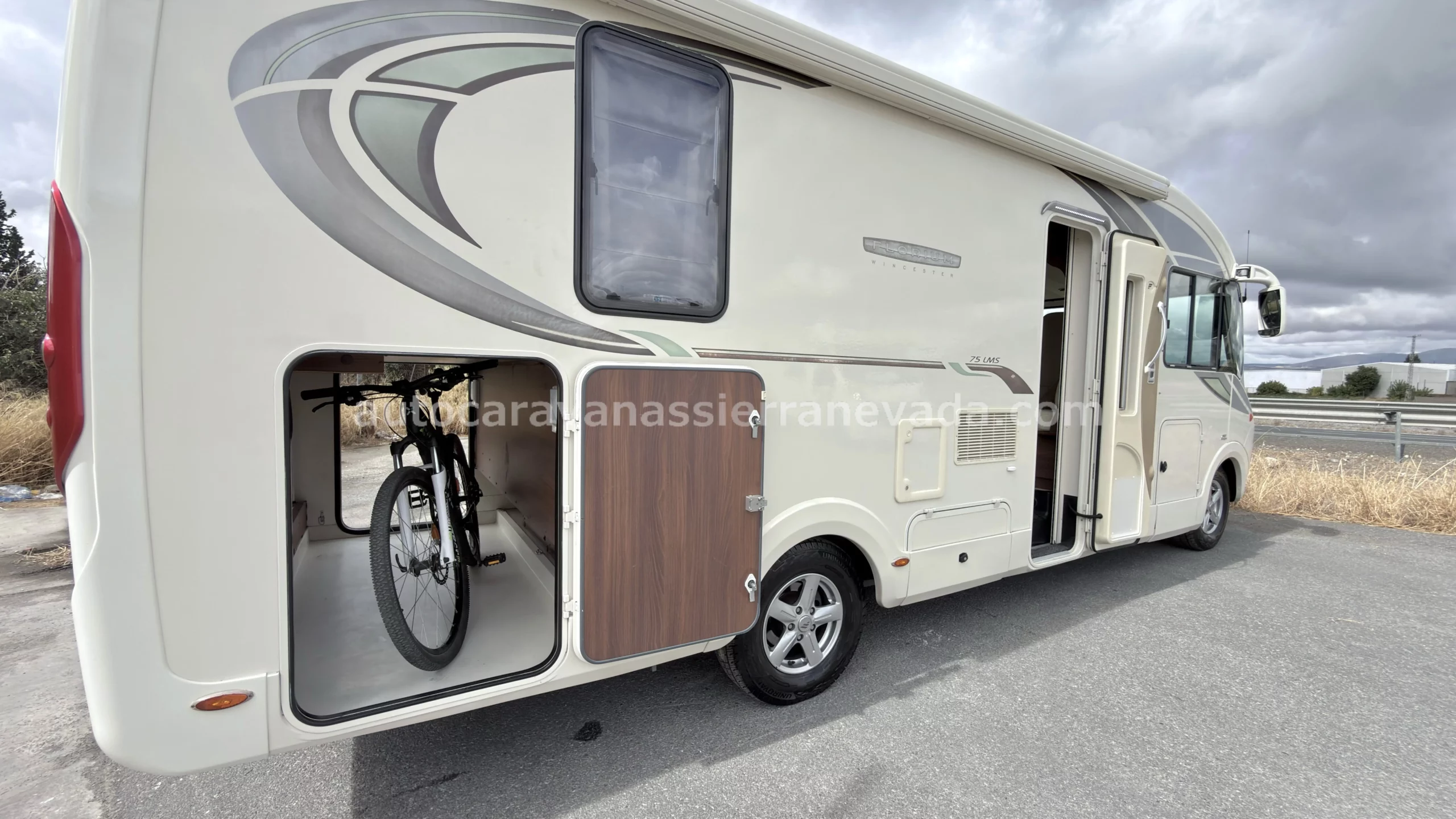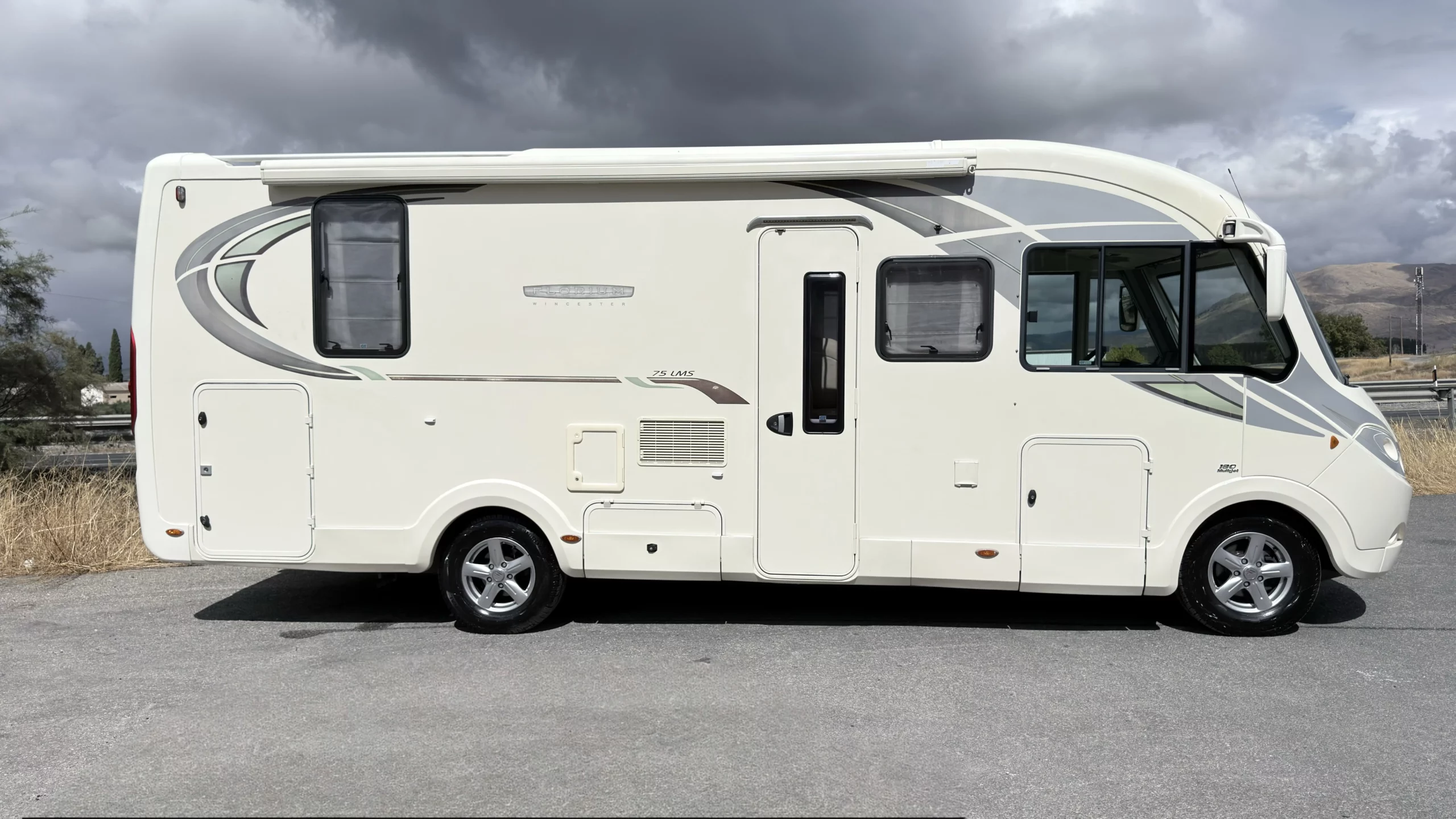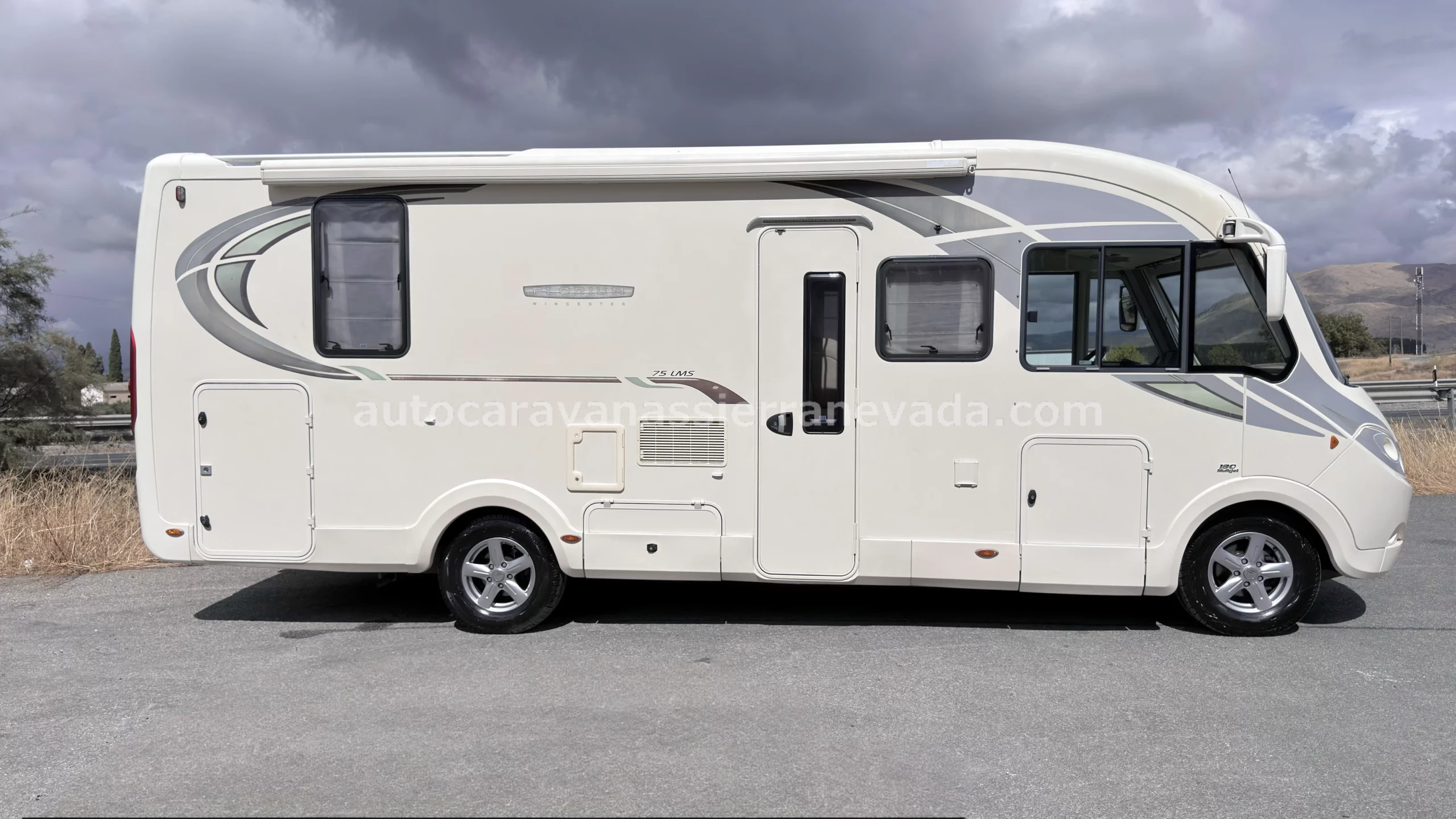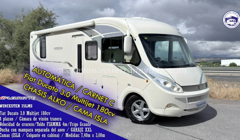 Autocaravana integral FLEURETTE, modelo FLORIUM WINCESTER 75LMS. Fleurette es la marca francesa de autocaravanas de alta gama por excelencia, destaca por su elegancia, robustez y calidad de acabado. Con motor Fiat Ducato 3.0 Multijet 180cv, AUTOMATICO un motor muy potente y duro al cual se le puede hacer muchísimos kilómetros, con CADENA DE DITRIBUCIÓN.La calefacción y el agua caliente funcionan mediante la caldera ALDE a gas propano, insonora y de radiadores como en casa.Del año 2012, con tan solo 66.000km. Chasis ALKO y Suspensión con barras de torsión (mucho mejor que la suspensión de ballestas) y con gran espacio de almacenamiento en el doble suelo.Con 4 plazas homologadas para viajar y dormir gracias a sus siguientes camas; Cama Isla, este tipo de cama tambiénleproporciona una gran comodidad en todos los aspectos, tanto al hacerla como acostarse por ambos lados e incluso no molestar al otro al levantarse, además de conseguir un diseño muy selecto y cotizado en su interior y Cama doble colgante sobre la cabina.Fleurette le invita a un ambiente interior acogedor, combinando encanto, elegancia y refinamiento a la francesa. Se conduce con carnet C, su M.M.A 4.250kg la mayor ventaja es su capacidad de carga. Una gran autocaravana muy amplia, para hacer grandes viajes o incluso vivir en ella gracias a sus medidas: (,40m x 3,00m). Dispone de una Gran bodega con doble puerta:(2,15m x 1,05m x 1,05m).Dispone de Aire Acondicionado a 220v.