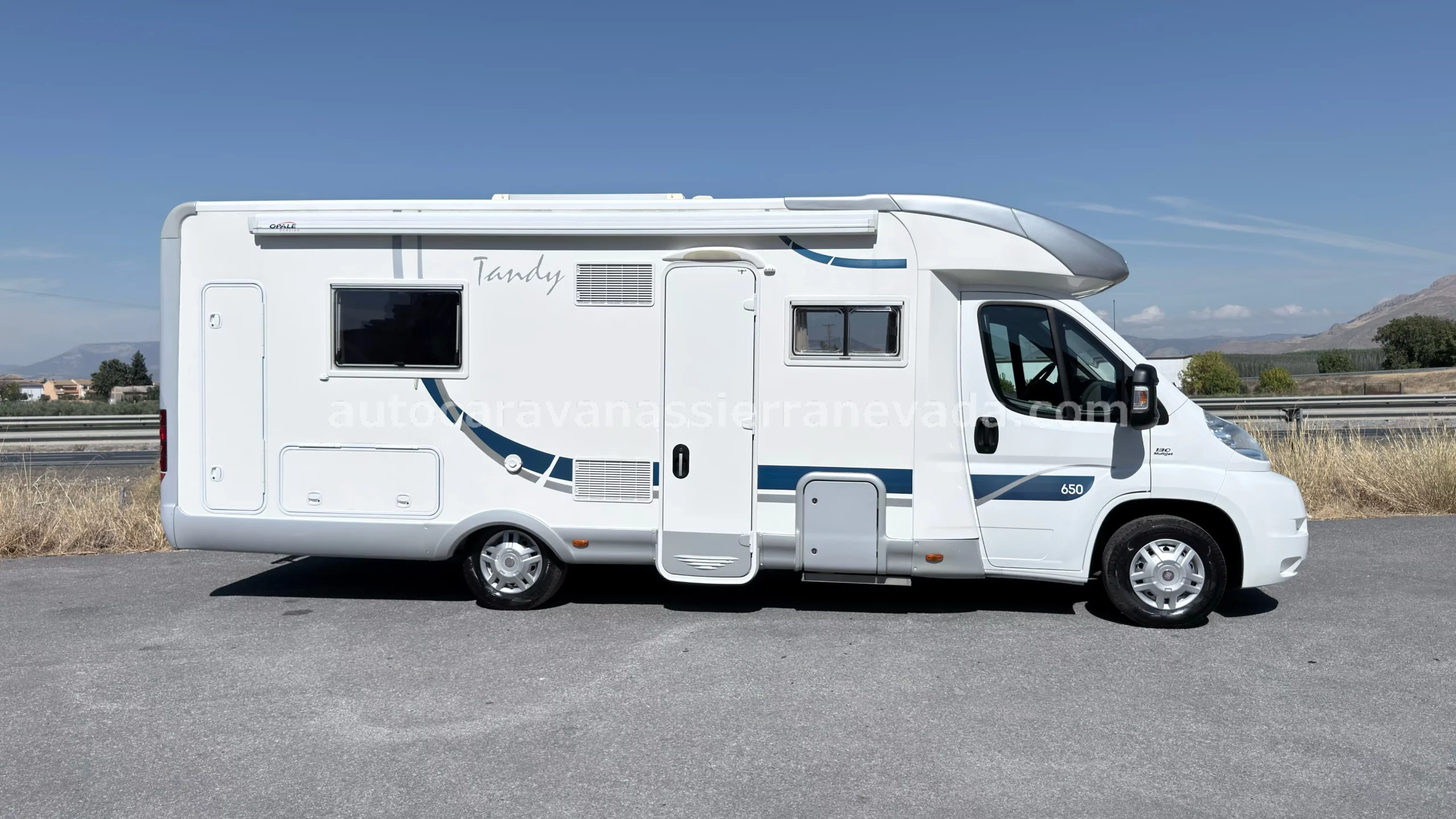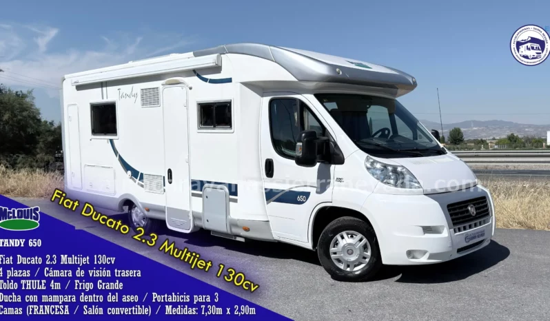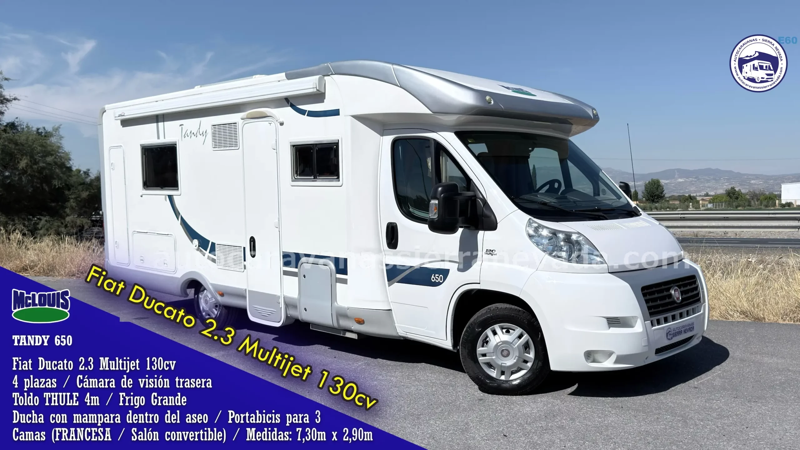 Autocaravana Perfilada de la marca McLouis, modelo TANDY 650.Una de las marcas más valoradas por su dureza en su construcción, durabilidad, comodidad y seguridad. Del año 2008 con 91.000km, procedente de particular. Con motor Fiat Ducato 2.3 MultiJet 130cv y 6 velocidades. Un motor moderno, muy fiable y de mantenimiento sencillo. Dispone de 4 plazas homologadas en documentación para viajar y dormir gracias a sus siguientes camas: Francesa en la parte trasera y Salón Convertible, ambas muy amplias. Tiene un maletero con unas medidas de (1,15 largo x 1,20 ancho x 0,60alto). Una autocaravana muy amplia, perfecta para familias ideal para hacer viajes de larga estancia y vivir en ella, con una medidas: (7,30m x 2,90m).