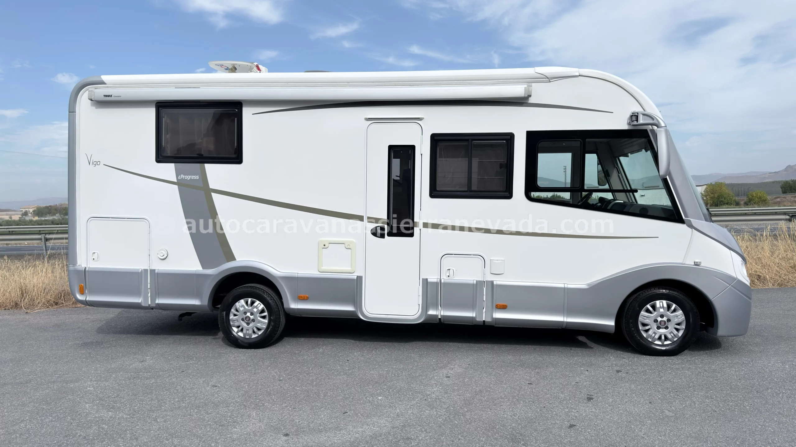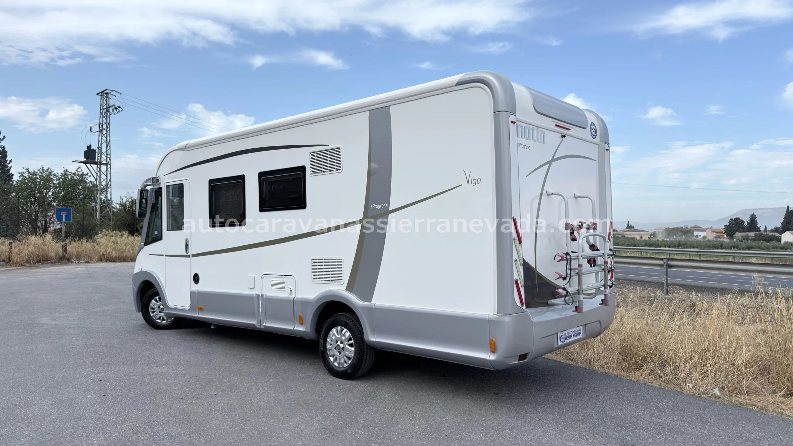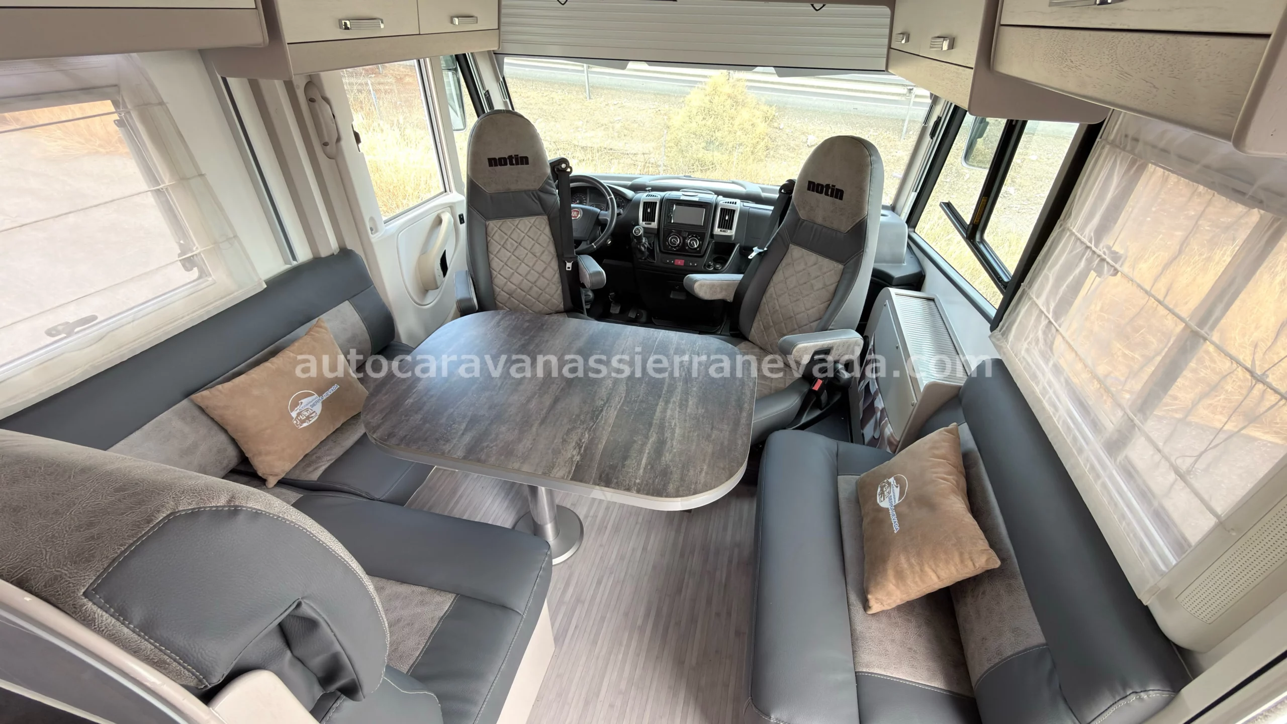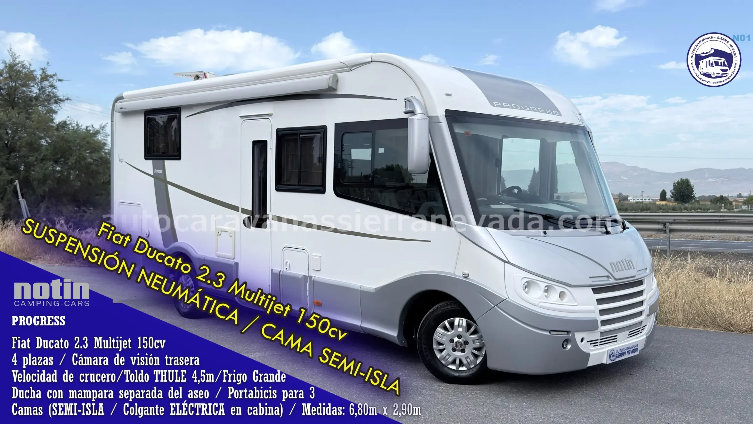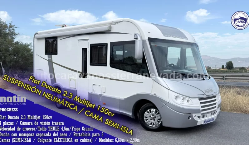 Autocaravana Integral NOTIN modelo PROGRESS, modelo de alta gama prestigiosa marca francesa de grupo TRIGANO, con terminaciones, aislantes y acabados de mucha calidad. Del año 2016 muy cuidada y procedente de particular, con motor Fiat Ducato 2.3 MultiJet 150cv super potente, robusto y con tan solo 49.000km. Con Suspensión neumática .Un vehículo muy bien distribuido a pesar de no tener unas medidas excesivamente grandes (6,80m x 2,90m), perfecta para gente que quiere una autocaravana muy cómoda de llevar y entrar en aparcamientos reducidos, se conduce igual que un turismo. Con 4 plazas para viajar homologadas en documentación  y dormir gracias a sus dos camas: Semi-isla con cabecero reclinable. Esta proporciona una gran comodidad en todos los aspectos, tanto al hacerla, como acostarse por ambos lados e incluso no molestar al otro al levantarse y Colgante eléctrica en cabina. Este vehículo ofrece un garaje muy espacioso con unas medidas: (1,40m x 0,95m x 0,75m).
