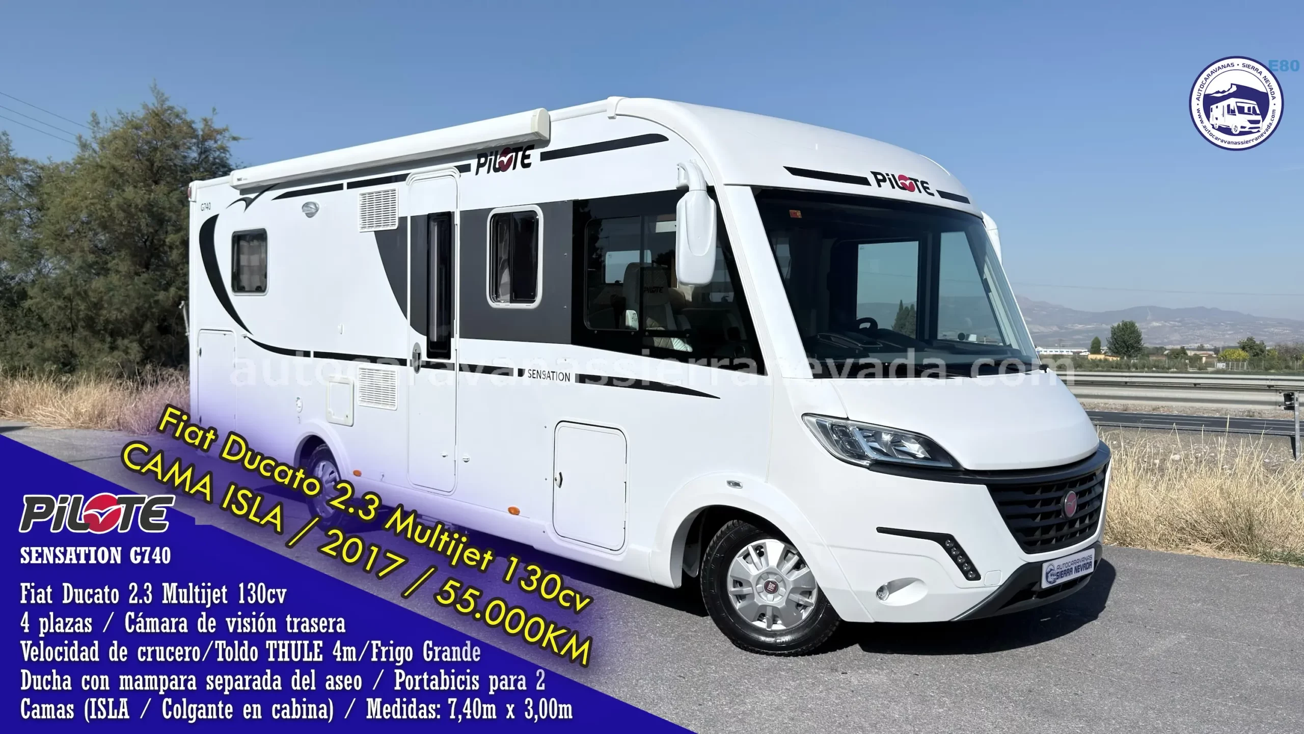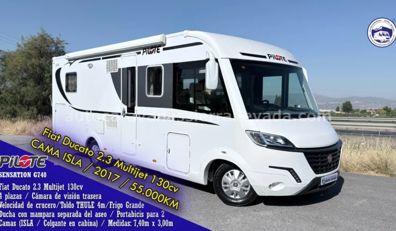 Autocaravana integral marca PILOTE, modelo SENSATION G740 la gama más alta de PILOTE, está situada en el mercado entre una de las mejores de Europa. Con un diseño elegante, moderno, con acabados y muebles de alta calidad. Su estructura resistente y duradera ha obtenido la certificación Clase 3 por sus cualidades de aislamiento, perfecta para zonas muy frías y soportando temperaturas elevadas. Consta de ventanas de máxima calidad con marco de aluminio que le evitara de ruidos en circulación al ir la ventana embutida en el marco. Del año 2017, con tan solo 55.000km y toda su documentación que los certifican. Con un motor muy duro, Fiat Ducato 2.3 MultiJet 130cv, motor muy duro y fiable, más que probado en los turismos, con 6 velocidades. Con 4 plazas homologadas para viajar y dormir, gracias a sus dos camas dobles; Cama Isla con grandes huecos de almacenaje, este tipo de cama también le proporciona una gran comodidad en todos los aspectos, tanto al hacerla como acostarse por ambos lados e incluso no molestar al otro al levantarse, además de conseguir un diseño muy selecto y cotizado en su interior + Colgante sobre cabina. Gracias a su interior tan amplio, esta increíble autocaravana es ideal para hacer grandes viajes dadas sus medidas (7,40m x 3,00m). Medidas maletero con doble portón muy espacioso: (2,25 largo x 1,00 ancho x 0,90alto).