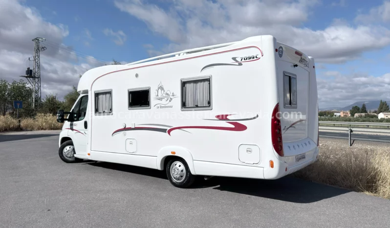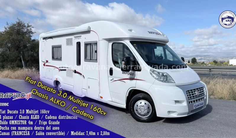 Autocaravana perfilada RAPIDO, modelo 7099C, una de las marcas más valoradas del mercado por su gran calidad, estando a la altura de Hymer, Niesmann, Euramobil entre otras. Con un gran motor, Fiat Ducato 3.0 MultiJet 160cv/CON CADENA DE DSTIBUCIÓN y 6 velocidades, muy potente, de fácil mantenimiento.Año 2007 con 90.000 kilómetros en carretera. Con Chasis ALKO y Suspensión con barras de torsión (mucho mejor que la suspensión de ballestas).Con 4 plazas para viajar y 3 dormir, disponiendo de una cama Francesaen la parte trasera, con acceso al maletero y Salón convertible.Autocaravana espaciosa y cómoda de llevar, ideal para usar como vivienda o viajes largos gracias a sus medidas (7,40m x 2,80m).Dispone de un amplio maletero, sus medidas son (1,25m x 1,90m x 0,50m).