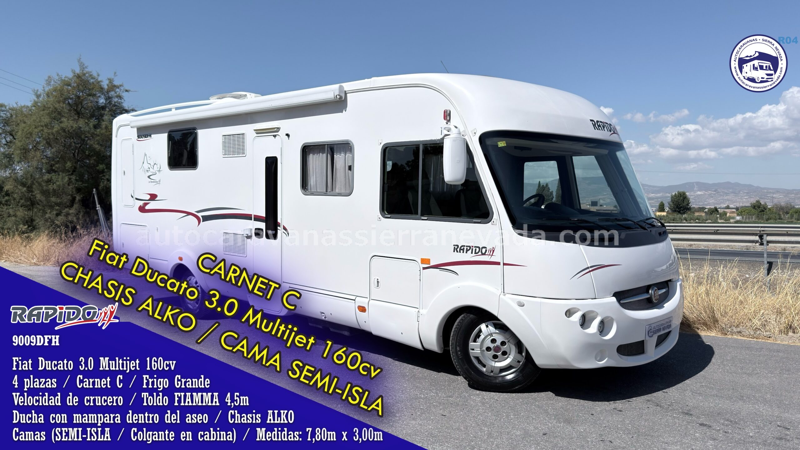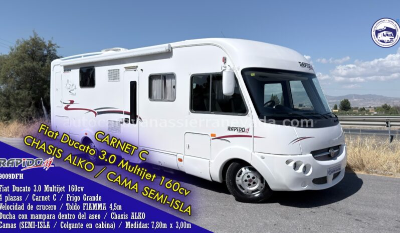 Autocaravana integral RAPIDO, modelo 9009DFH, una de las marcas más valoradas del mercado por su gran calidad. Con un diseño tanto interior como exterior moderno, con terminaciones y acabados de mucha calidad. Cuenta con un gran motor, Fiat Ducato 3.0MultiJet 160cv, muy potente, de fácil mantenimiento y con CADENA de Distribución, dispone de Chasis ALKO y Suspensión con barras de torsión (proporcionando más estabilidad en carretera). Año 2009, con 99.000 kilómetros. Con 4 plazas homologadas para viajar y dormir, gracias a sus camas; CAMA SEMI- ISLA. Esta proporciona una gran comodidad en todos los aspectos, tanto al hacerla, como acostarse por ambos lados e incluso no molestar al otro al levantarse y Colgante en Cabina. Esta increíble autocaravana mide: (7,80m x 3,00m), muy bien distribuida y perfecta para hacer largo viajes o vivir en ella. Dispone de un gran garaje, con unas medidas (2,00 largo x 1,00 ancho x 0,30 alto). ESTE VEHÍCULO SE CONDUCE CON EL CARNET C. M.M.A 4.250kg teniendo una gran cualidad que es la gran capacidad de carga.
